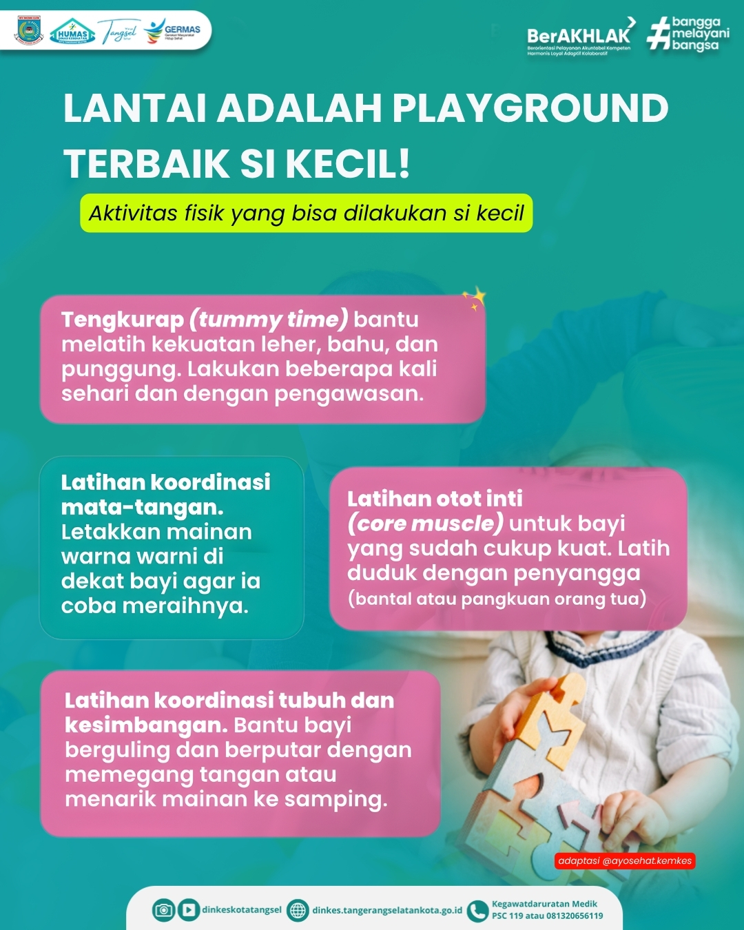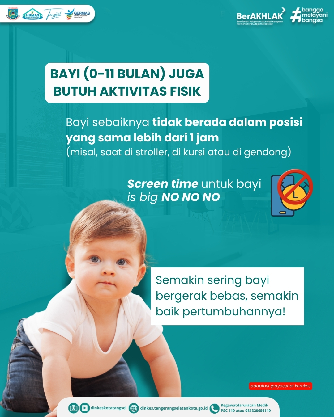 Sumber Gambar :Serang, 13 April 2026 - Kata siapa bayi cuma butuh makan dan tidur aja?! Bayi usia 0-11 bulan juga butuh aktivita fisik, ngga perlu berat. Cukup lakukan secara singkat, berulang, dan rutin setiap hari agar tumbuh kembangnya optimal.