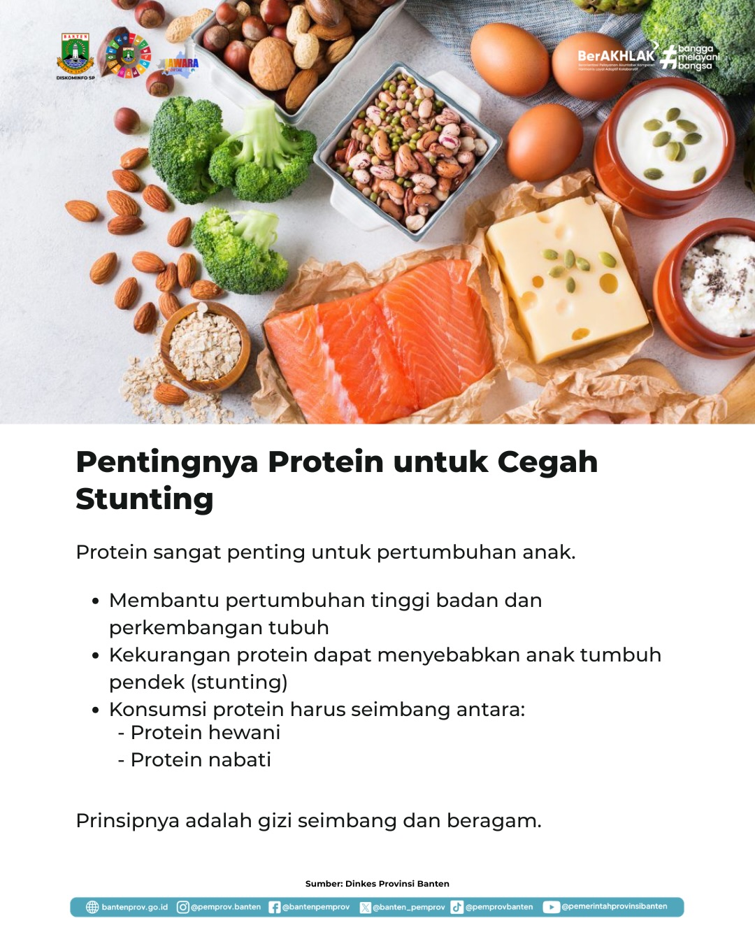Salah satu langkah penting untuk mencegah stunting adalah memastikan anak mendapatkan asupan gizi seimbang, termasuk protein hewani yang berperan penting dalam mendukung pertumbuhan dan perkembangan tubuh. Sumber protein hewani seperti telur, ikan, susu, dan daging mudah dijangkau masyarakat serta memiliki kandungan gizi yang baik bagi anak maupun ibu hamil. Namun, pemberiannya tetap harus disesuaikan dengan usia dan kebutuhan gizi anak. Pemprov Banten melalui Dinas Kesehatan terus mendorong peningkatan konsumsi protein hewani melalui edukasi gizi, kolaborasi lintas sektor, serta pemanfaatan potensi pangan lokal seperti hasil peternakan dan perikanan. Mari bersama mendukung pemenuhan gizi anak demi mewujudkan generasi Banten yang sehat, cerdas, dan bebas stunting.